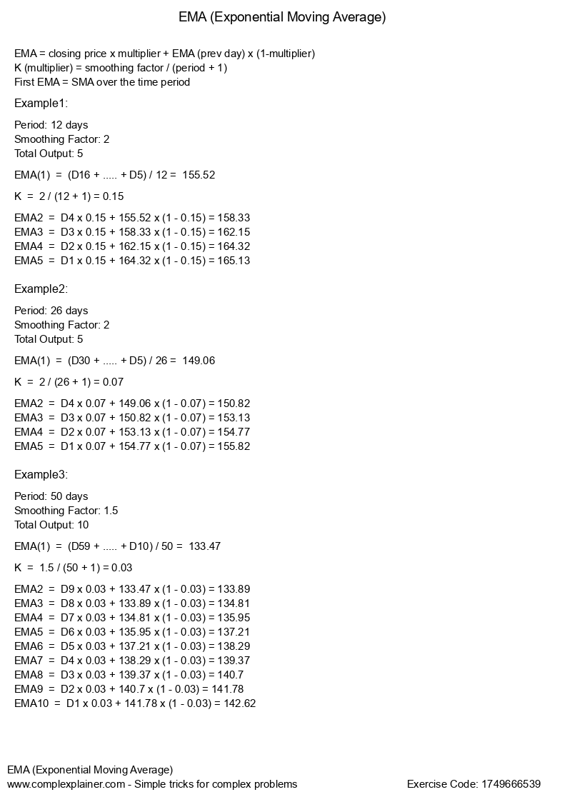 A financial formula that gives greater weight to recent data (i.e. prices). Unlike SMA, EMA doesn't assign equal weights to all values, meaning recent values are considered more important.