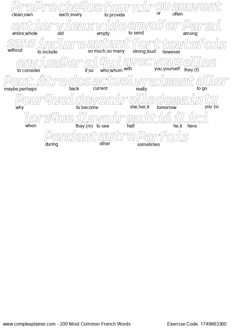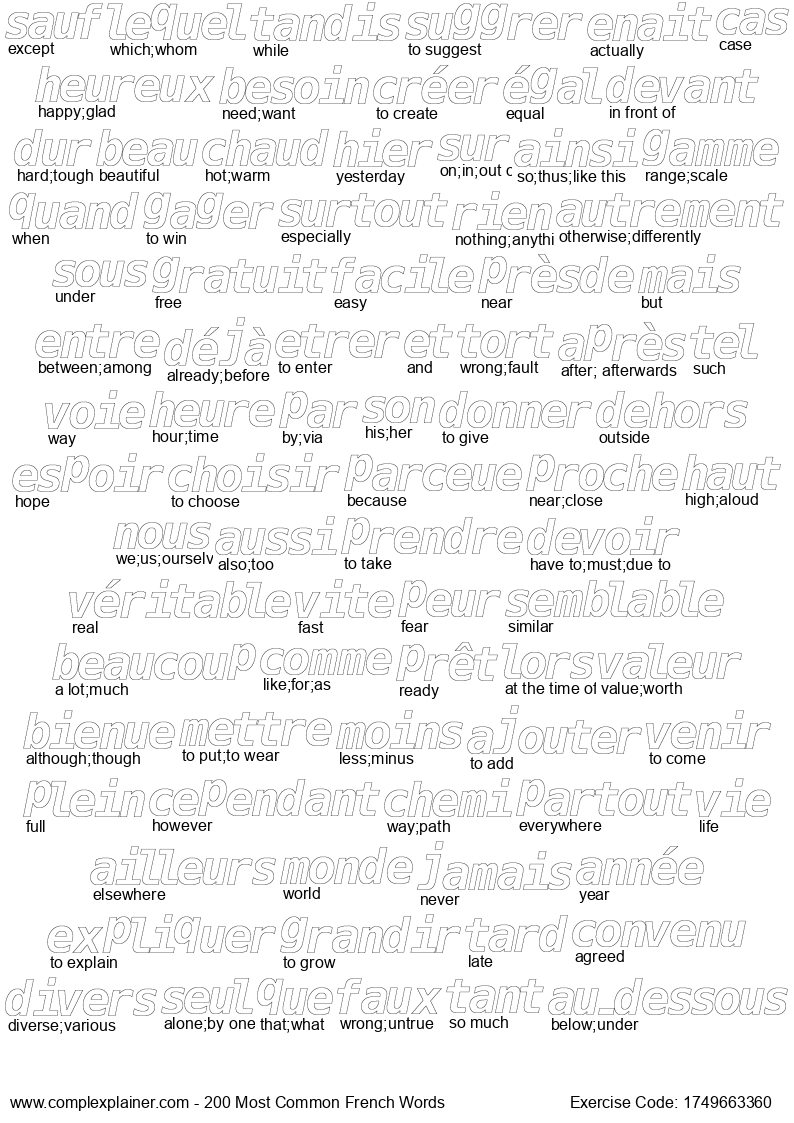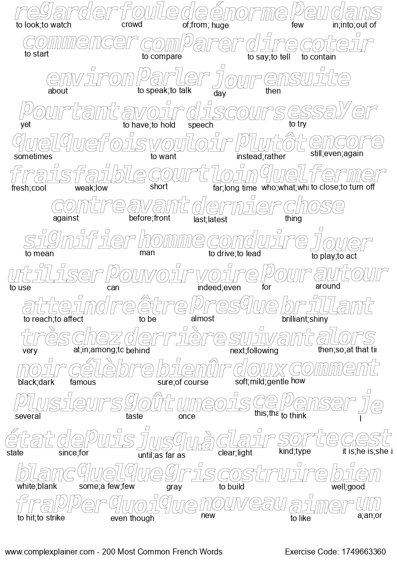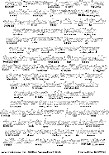 Like coloring book for relaxation? Why not doing the activity while at the same time memorizizing top 200 french words? Download and print the pages below. The words are based on 50 articles on french news sites.