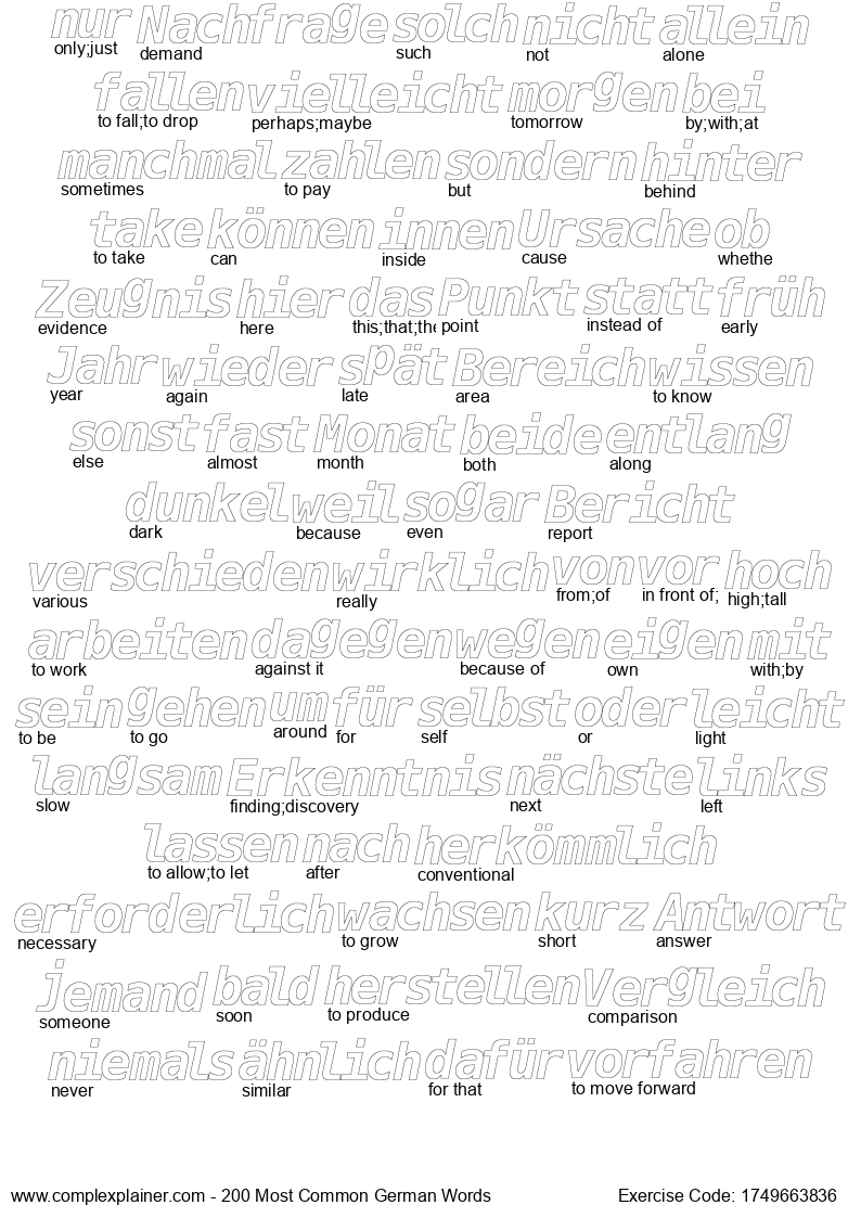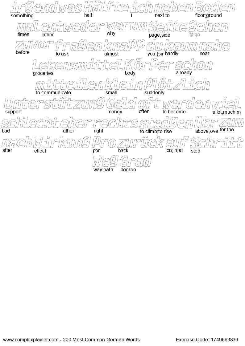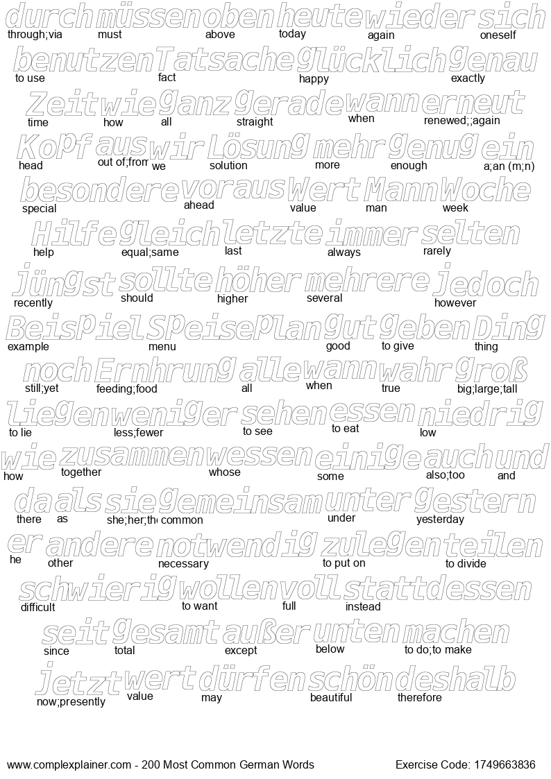 Like coloring book for relaxation? Why not do the activity while at the same time memorizizing top 200 German words? Download and print the pages below. The words are based on 50 articles on some German news sites.